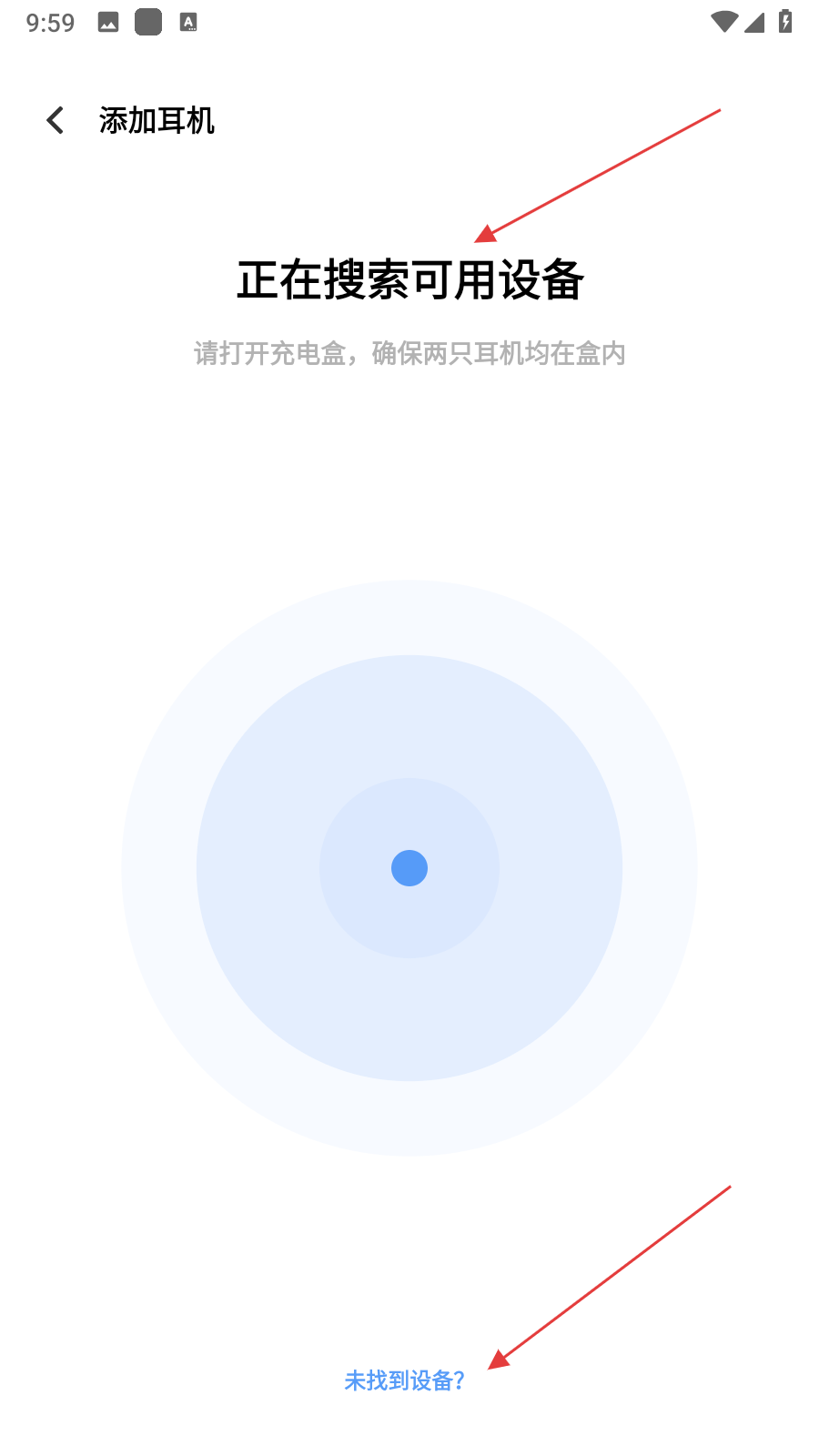 2、點(diǎn)擊添加耳機(jī)后,軟件進(jìn)入搜索狀態(tài),此時按照提示打開耳機(jī)充電盒,確保兩只耳機(jī)都在盒內(nèi),等待軟件搜索耳機(jī)設(shè)備,如果長時間未搜索到,點(diǎn)擊下方未找到設(shè)備。