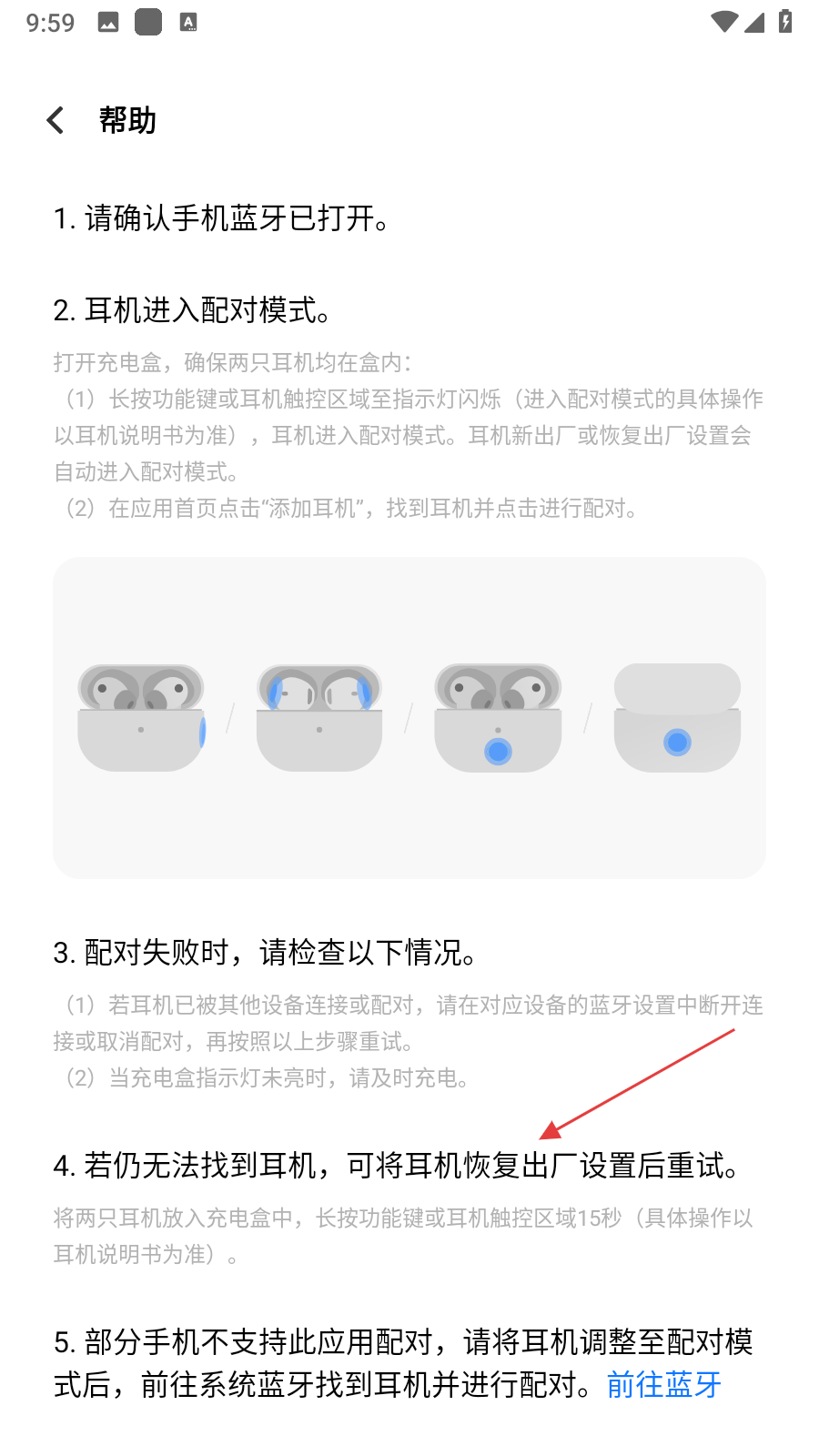 3、根據(jù)指引仍無法找到耳機(jī)可將耳機(jī)恢復(fù)出廠設(shè)置后重試,部分手機(jī)不支持應(yīng)用配對,可在耳機(jī)配對模式下前往系統(tǒng)藍(lán)牙配對。
