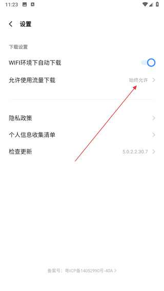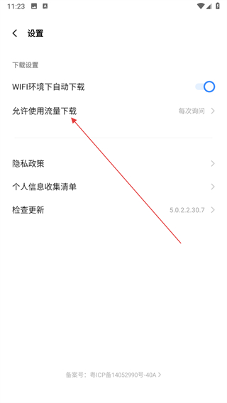 2、在設(shè)置頁面中找到允許使用流量下載選項(xiàng),點(diǎn)擊該選項(xiàng)。