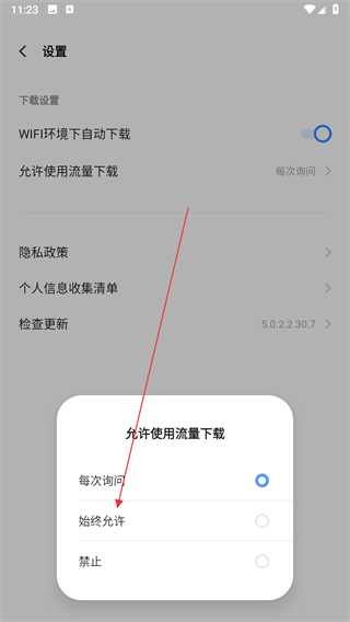 4、返回設(shè)置頁面后,允許使用流量下載會顯示為始終允許。