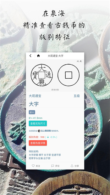 泉海app支持古錢(qián)幣查詢對(duì)版。本應(yīng)用為古錢(qián)幣收藏愛(ài)好者提供專(zhuān)業(yè)、精準(zhǔn)的錢(qián)幣版別查詢功能。整合了海量錢(qián)幣數(shù)據(jù)信息,方便網(wǎng)友們?cè)诰€輕松搜索和查找感興趣的古錢(qián)幣信息。支持在線上傳、分享等操作。需要這個(gè)程序的朋友趕緊來(lái)安裝吧。