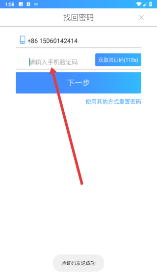 3、在點擊發(fā)送驗證碼按鈕,等待后填寫驗證碼,即可進入到下一步驟。