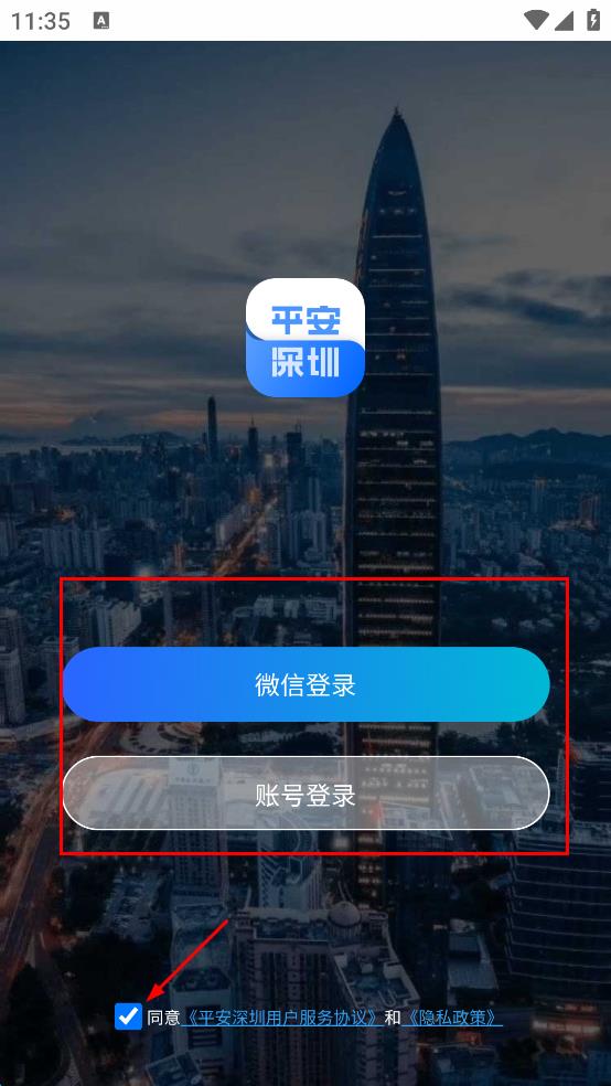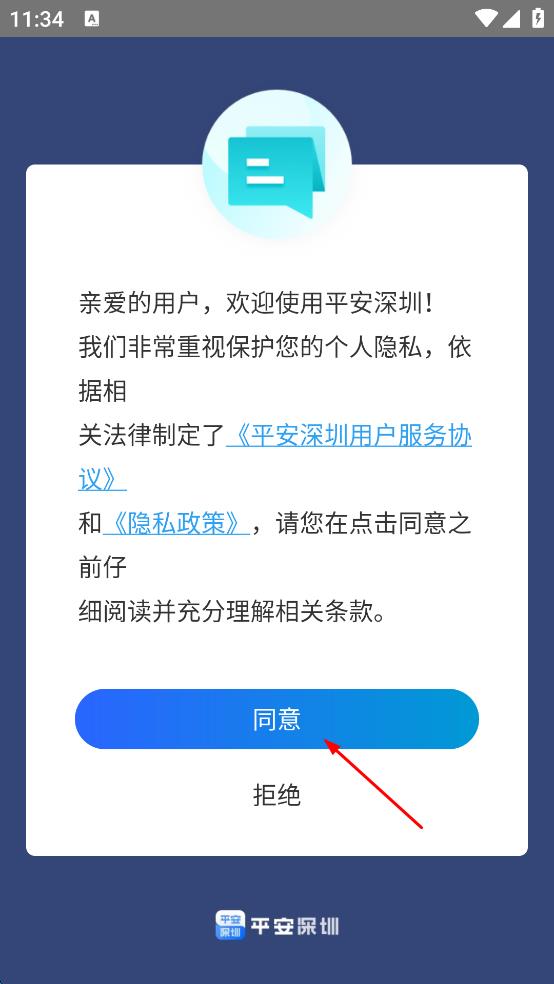 1、打開平安深圳APP,在彈出的用戶服務(wù)協(xié)議和隱私政策提示框中,仔細(xì)閱讀相關(guān)內(nèi)容后,點(diǎn)擊“同意”,進(jìn)入登錄方式選擇頁面。