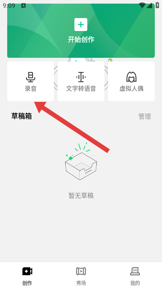 1、進(jìn)入創(chuàng)作界面后,點(diǎn)擊錄音選項(xiàng),進(jìn)入錄音功能對(duì)應(yīng)的頁面。