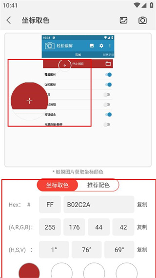 3、在坐標(biāo)取色界面,觸摸圖片獲取坐標(biāo)顏色,查看對(duì)應(yīng)的色彩數(shù)值。