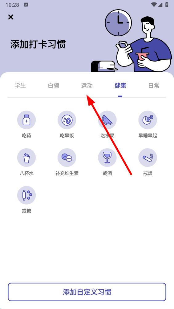 3、在添加打卡習(xí)慣頁面,點(diǎn)擊上方的運(yùn)動(dòng)分類標(biāo)簽,切換到運(yùn)動(dòng)類打卡選項(xiàng)。