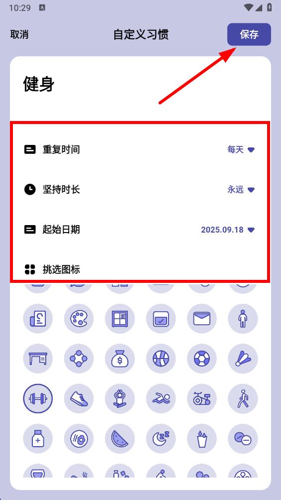 5、在頁面設(shè)置重復(fù)時(shí)間、堅(jiān)持時(shí)長(zhǎng)、起始日期等信息后,點(diǎn)擊保存即可完成健身打卡功能添加。