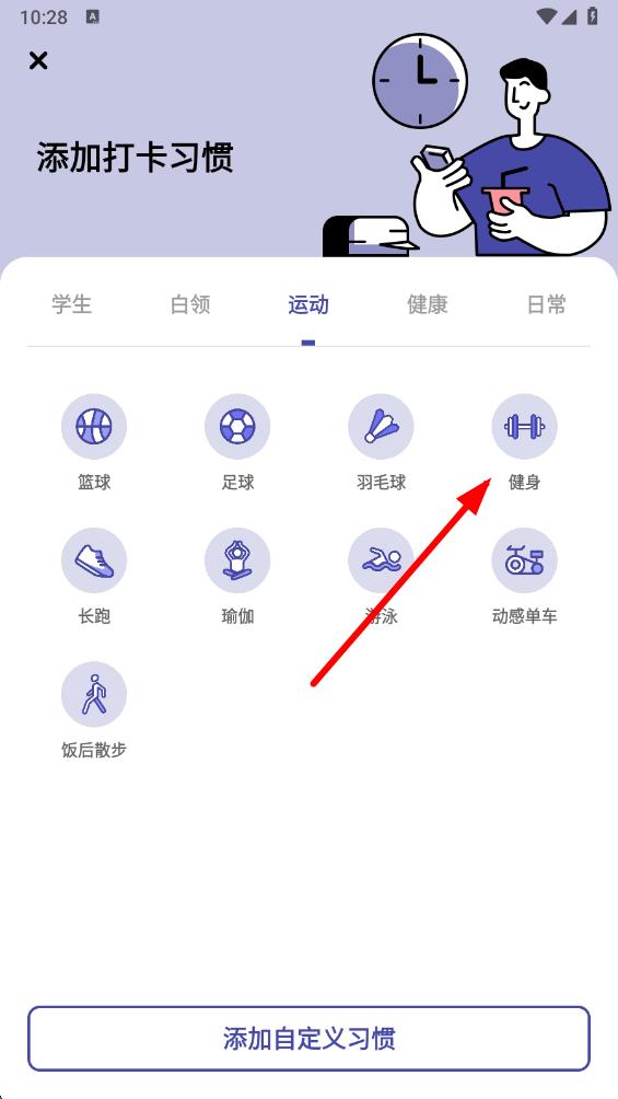 4、在運(yùn)動(dòng)類打卡選項(xiàng)里,點(diǎn)擊健身圖標(biāo),進(jìn)入自定義習(xí)慣設(shè)置頁面。