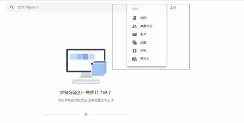 2、點(diǎn)擊“繼續(xù)”,在頁(yè)面右上角有兩個(gè)選項(xiàng),分別是“創(chuàng)建”和“上傳”,點(diǎn)擊“創(chuàng)建”,可以發(fā)現(xiàn),我們可以新建“相冊(cè)”“共享相冊(cè)”“影片”等。下面我會(huì)以上傳照片為例,教大家使用google photos并創(chuàng)建屬于自己的相冊(cè)。