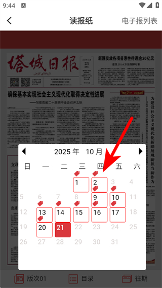 4、可以通過(guò)日歷來(lái)選擇具體的日期,查看對(duì)應(yīng)日期的報(bào)紙內(nèi)容。