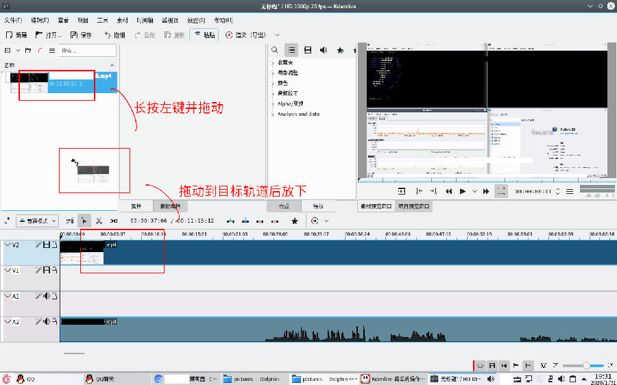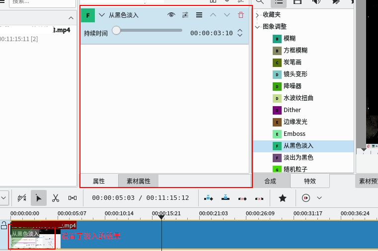 第二種和添加素材到時(shí)間軸類似,先選中要添加的特效項(xiàng)目,按住鼠標(biāo)不動(dòng),將其拖動(dòng)到目標(biāo)素材即設(shè)置成功。但不保證所有特效項(xiàng)目都被顯示在特效窗口中。已添加的特效則可在屬性窗口中編輯。