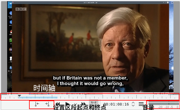 播放區(qū)段:被框出的兩個(gè)按鈕用于設(shè)置預(yù)覽窗口時(shí)間軸上預(yù)覽區(qū)段的起點(diǎn)和終點(diǎn),“播放”按鈕右部的小箭頭下拉框中可以選擇“播放區(qū)段”。