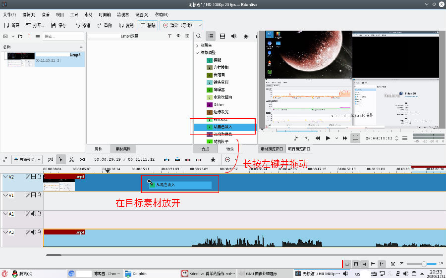 為了視頻生硬,可以添加視頻效果。在kdenlive中,效果分為 淡入淡出效果 轉(zhuǎn)場(chǎng)效果 視頻效果 三種類型,每種效果的添加調(diào)整方法略有不同。