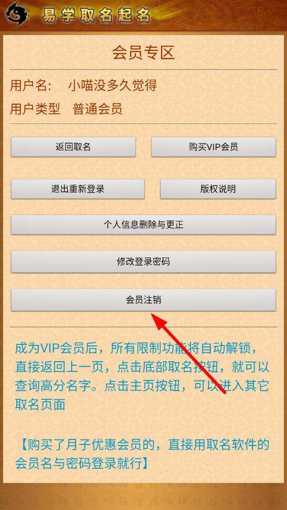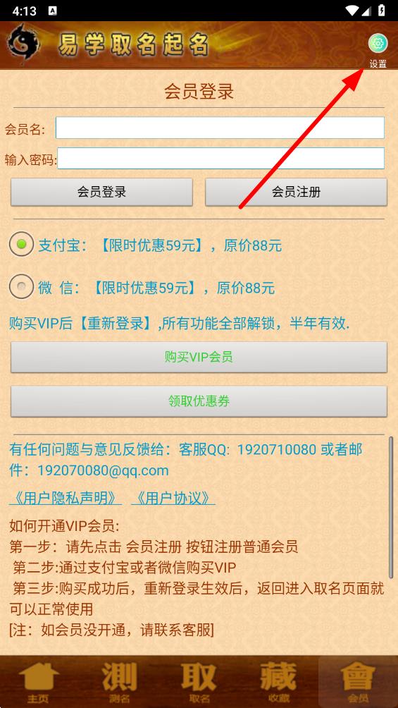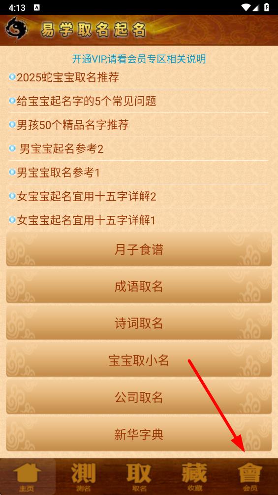 1、打開易學(xué)起名app,點(diǎn)擊底部導(dǎo)航欄最右側(cè)的會(huì)員按鈕,進(jìn)入會(huì)員相關(guān)操作界面。