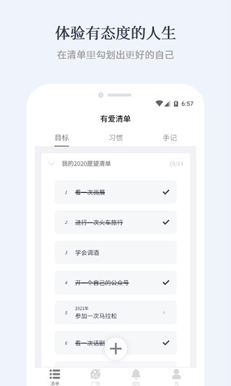 有愛清單無論是個人目標還是生活記事這里都可以滿足你的記錄需求,支持多種記錄模式,你可以根據(jù)自己的需求選擇對應的模式創(chuàng)建事件。在這里定制目標每天都會提醒你按時完成打卡,還有記錄自己每天發(fā)生的有趣的事情,同時還能創(chuàng)建一周安排哦。歡迎有需要的朋友下載使用!