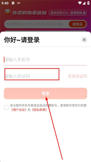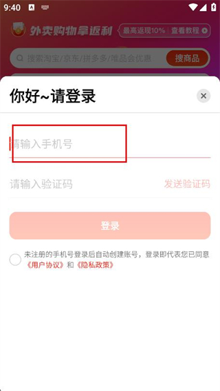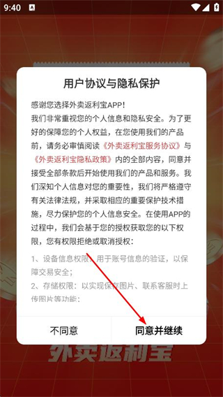 1、打開外賣返利寶,在彈出的界面,點擊同意并繼續(xù)。