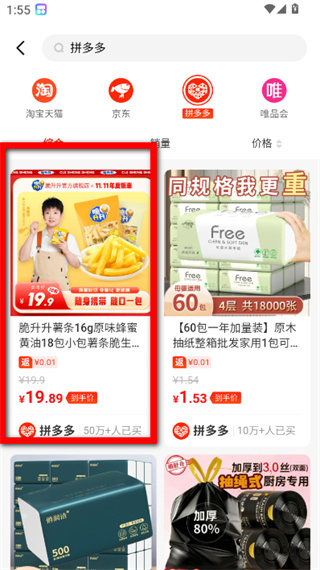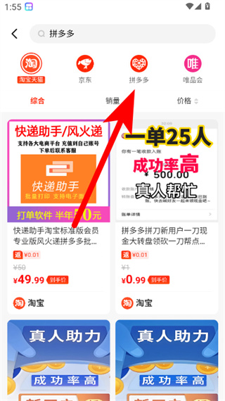 3、在搜索結(jié)果界面,點擊對應平臺如拼多多選項,進入平臺商品列表頁面。