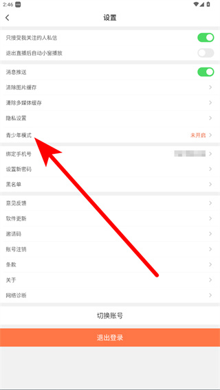 3、在設(shè)置界面里,找到并點擊青少年模式選項。