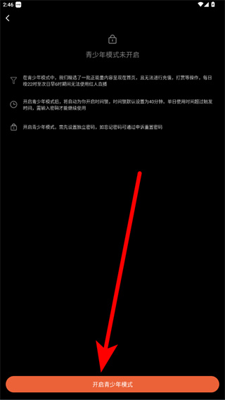 4、在青少年模式頁面,點擊開啟青少年模式按鈕,按提示完成操作即可開啟。