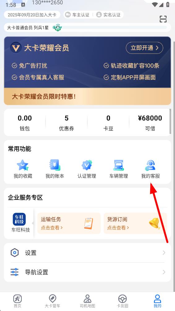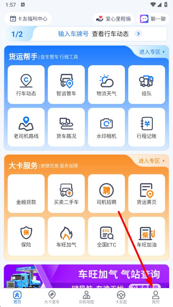 1、打開車旺大卡app,點擊底部導(dǎo)航欄最右側(cè)的我的選項。
