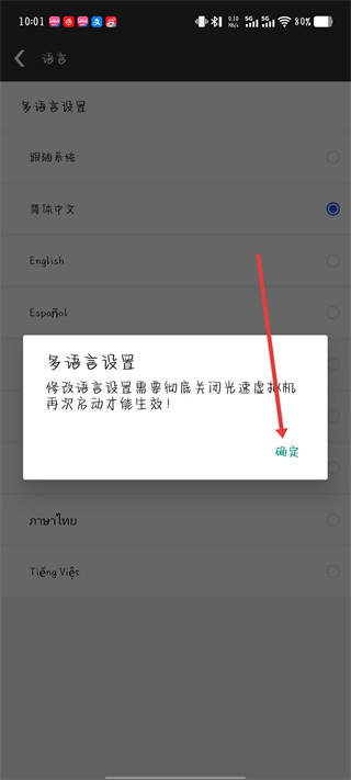 4、彈出多語言設(shè)置提示框,點(diǎn)擊確定按鈕,即可更改生效。