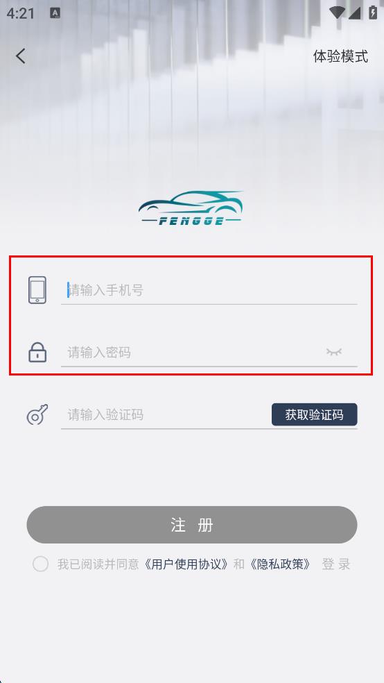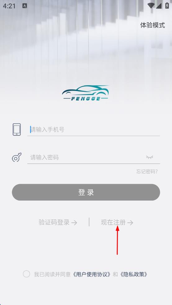 1、打開“FENGGE”APP,在登錄界面點擊“現(xiàn)在注冊”選項,進入注冊頁面。