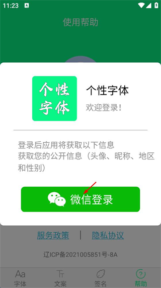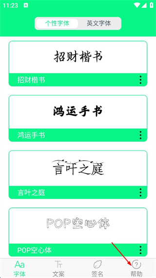 1、進(jìn)入軟件字體頁面,點(diǎn)擊右下角幫助。