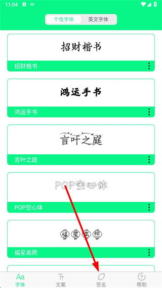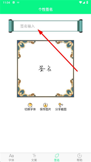 1、打開個(gè)性字體應(yīng)用,點(diǎn)擊底部簽名選項(xiàng),進(jìn)入個(gè)性簽名制作界面。