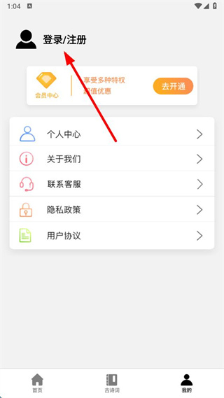 1、在練字打卡我的頁面,點(diǎn)擊登錄注冊(cè),進(jìn)入登錄頁面。