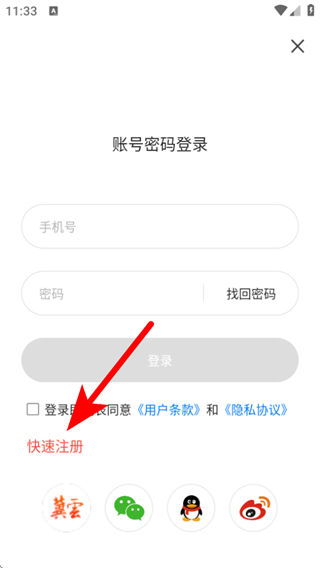 3、進入這個界面后,需要點擊快速注冊按鈕,進入注冊的頁面。