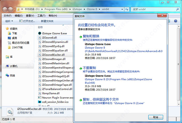 6、回到安裝包,這里有32位和64位兩個(gè)目錄,選擇符合系統(tǒng)的打開,將其中的文件“iZotope Ozone 8.exe”復(fù)制到軟件軟件安裝目錄下覆蓋源文件,默認(rèn)安裝目錄為C:\Program Files (x86)\iZotope\Ozone 8\win64