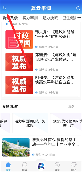 1、打開冀云豐潤APP首頁,點(diǎn)擊左上角個(gè)人圖標(biāo),進(jìn)入個(gè)人頁面。