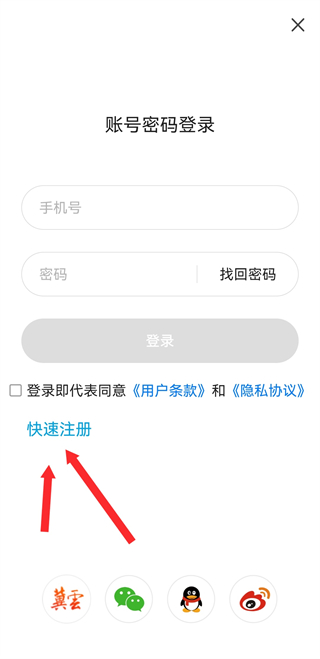3、在賬號(hào)登錄的頁面,我們需要點(diǎn)擊快速注冊(cè),進(jìn)入注冊(cè)的頁面。