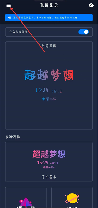 1、打開(kāi)息屏顯示應(yīng)用,點(diǎn)擊左上角的菜單按鈕。