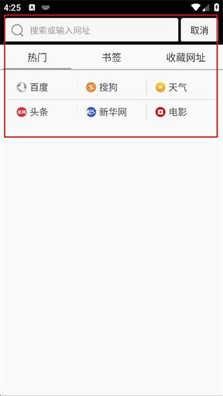 4、在搜索界面中可選擇熱門、書簽、收藏網(wǎng)址分類,或直接輸入網(wǎng)址進(jìn)行搜索。