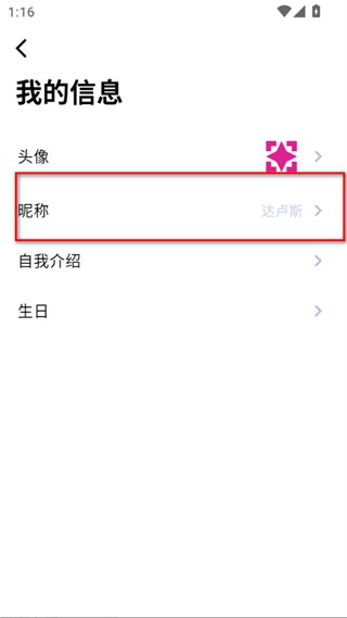 5、在我的信息頁面,點(diǎn)擊昵稱選項(xiàng),輸入新的昵稱后完成保存,即可修改名字。