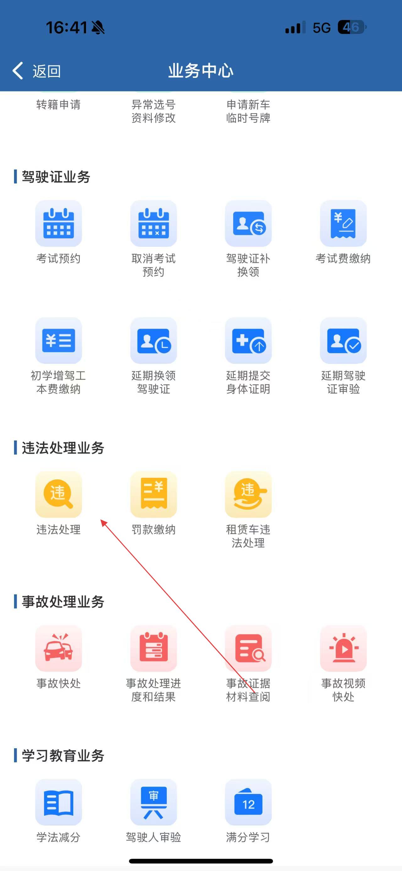 1、打開(kāi)交管12123 APP進(jìn)入業(yè)務(wù)中心,點(diǎn)擊違法處理選項(xiàng),進(jìn)入違法處理操作頁(yè)面。