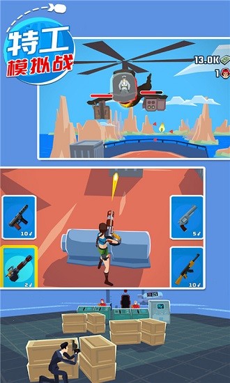 特工模擬戰(zhàn)一款休閑益智類型的闖關射擊手機游戲,游戲采用經典的3D畫面作為游戲背景,以獨特的射擊槍戰(zhàn)作為游戲的核心玩法。在游戲中,玩家需要消滅關卡中所有的敵人,擊殺的越多,積分就越多,玩家還可以兌換更好的武器裝備。