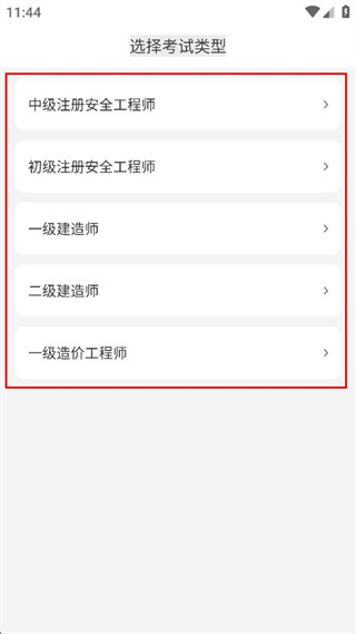 4、根據(jù)需求選擇相應(yīng)的考試類型,如中級(jí)注冊(cè)安全工程師、一級(jí)建造師等,完成考試類型選擇流程。
