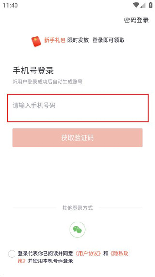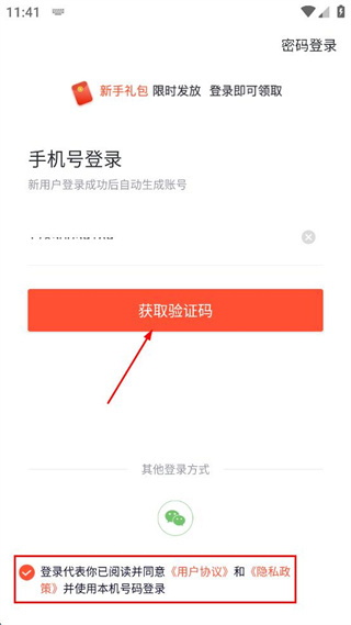 1、在職業(yè)考試APP手機(jī)號(hào)登錄界面輸入手機(jī)號(hào)碼,勾選已閱讀并同意用戶協(xié)議和隱私政策,點(diǎn)擊獲取驗(yàn)證碼。
