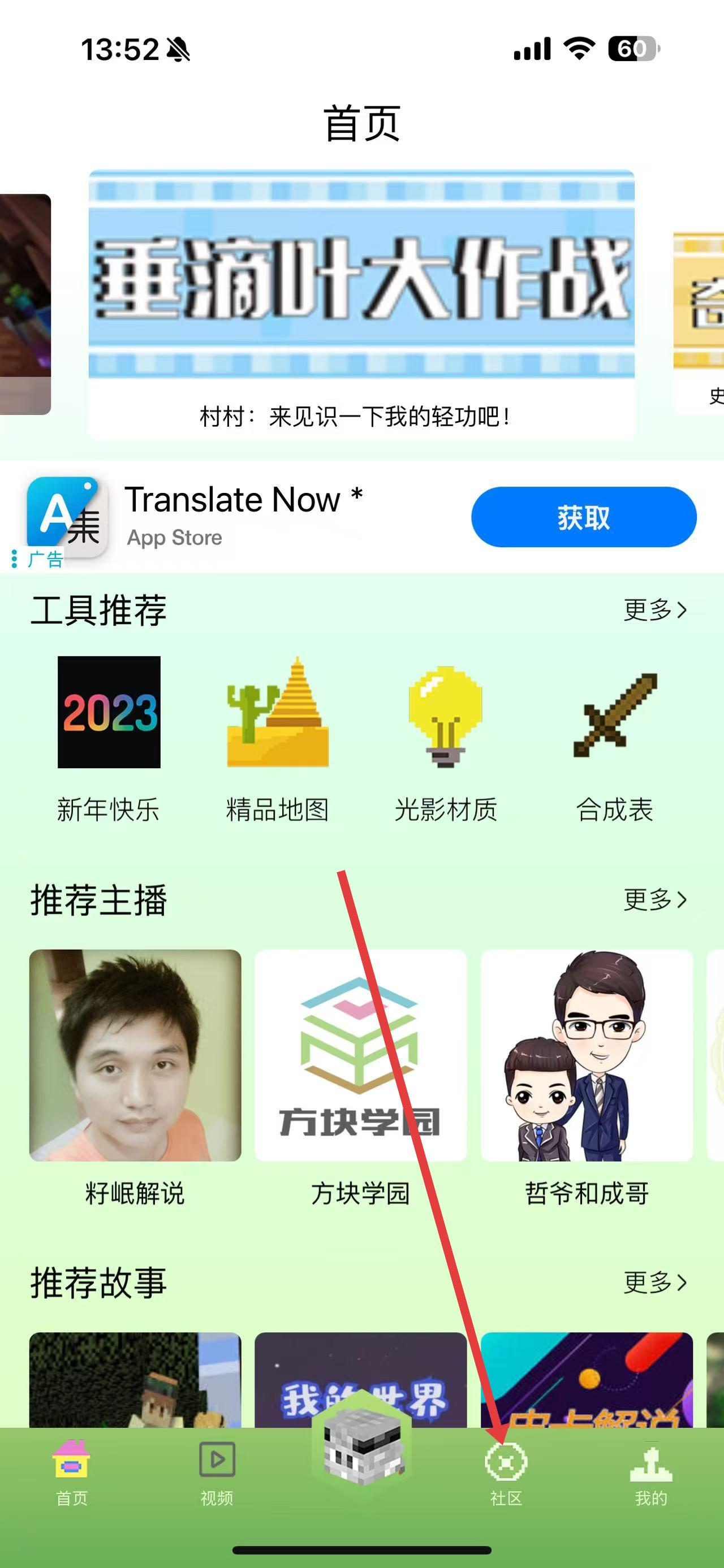 1、打開我的世界基巖版大師盒子應(yīng)用,點(diǎn)擊底部導(dǎo)航欄中的社區(qū)選項(xiàng)。