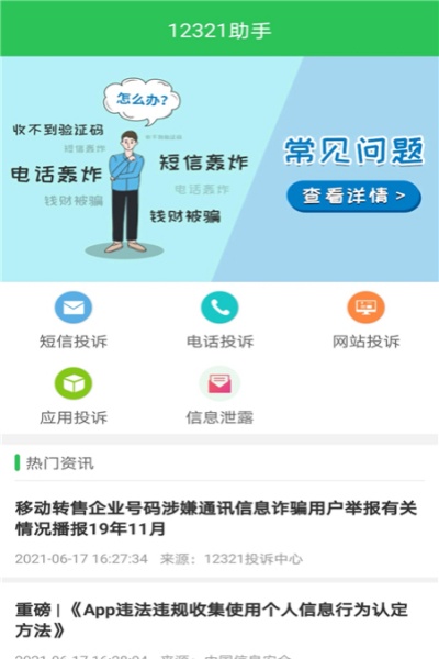 12321舉報(bào)中心官方app是12321網(wǎng)絡(luò)不良與垃圾信息舉報(bào)受理中心官方推出的手機(jī)防詐騙軟件,提供了詐騙電話、短信息等在線投訴服務(wù),網(wǎng)友們可以直接在線舉報(bào)收到的詐騙類數(shù)據(jù)信息。起到了全網(wǎng)人人監(jiān)督、反詐作用,方便大家在線舉報(bào)不良信息,投訴垃圾短信、詐騙電話等,實(shí)時(shí)反饋受理,處理結(jié)果一手掌握,操作簡(jiǎn)單又快捷,歡迎安裝使用。