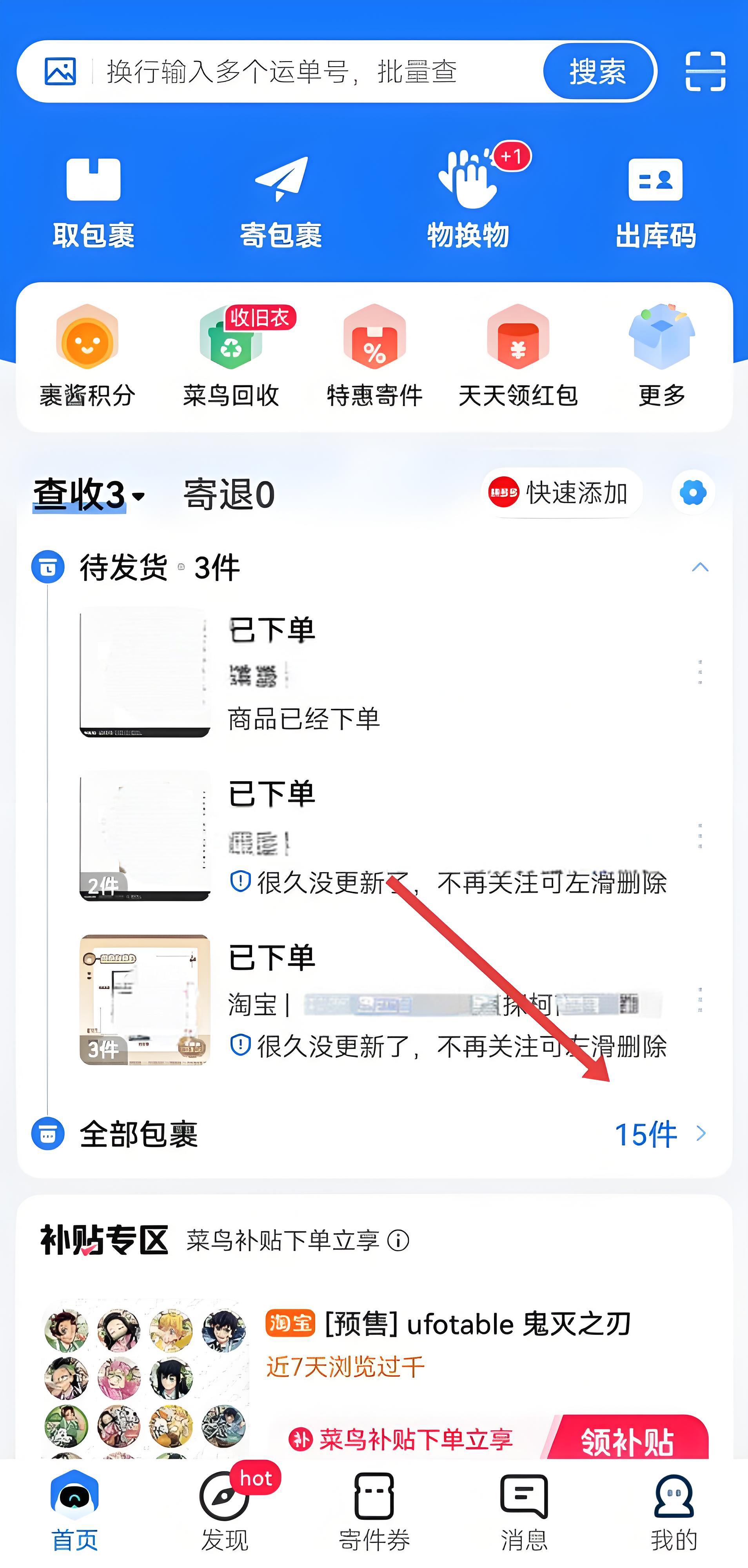 1、打開菜鳥APP,進(jìn)入首頁后點擊全部包裹,位于查收板塊下方,顯示包裹總數(shù),進(jìn)入包裹記錄列表頁面。