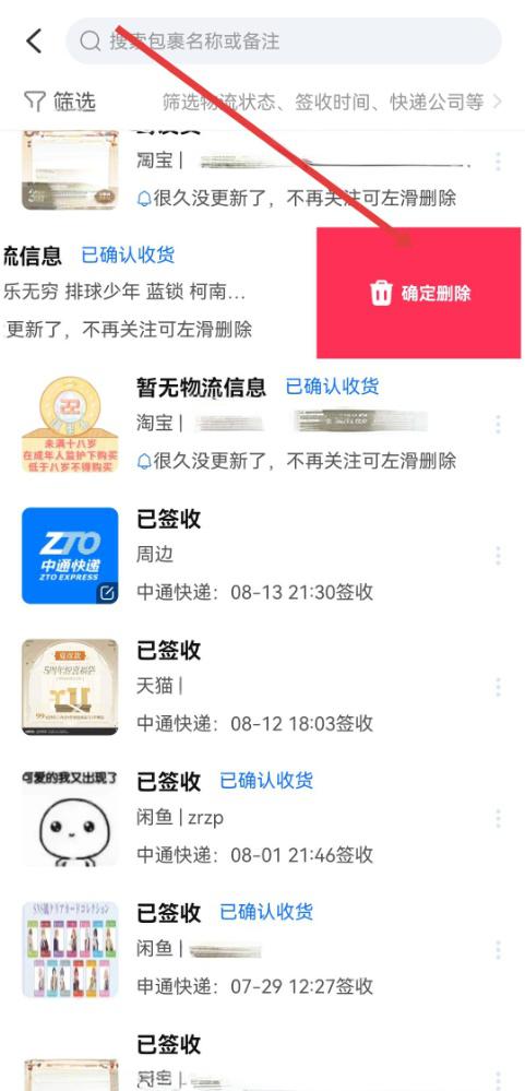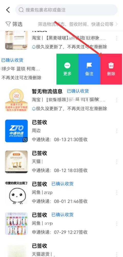 2、在包裹列表中,找到需要刪除的包裹條目,用手指向左滑動這個條目,然后右側(cè)就會出現(xiàn)刪除的按鈕。