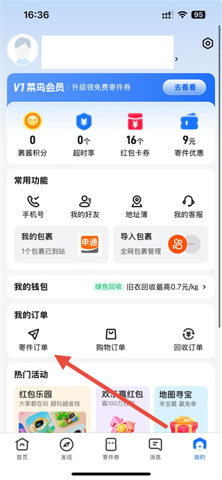 2、在我的頁面,點擊寄件訂單選項,進(jìn)入訂單列表頁面。
