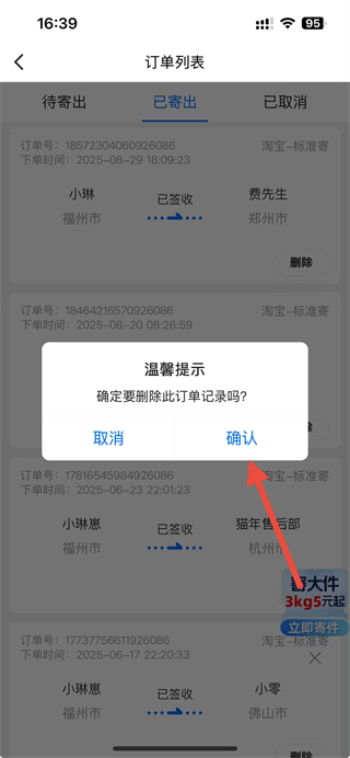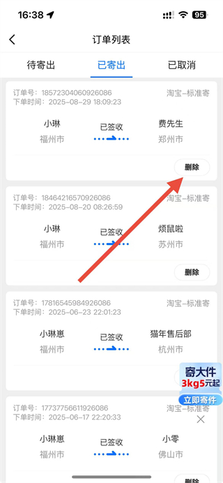 3、在訂單列表頁面,找到想要刪除的寄件訂單,點擊其右側(cè)的刪除按鈕。