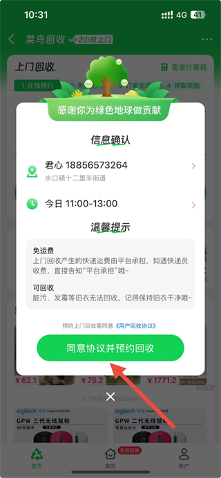 4、在提示框中點擊同意協(xié)議并預(yù)約回收按鈕,即可完成上門回收預(yù)約操作。
