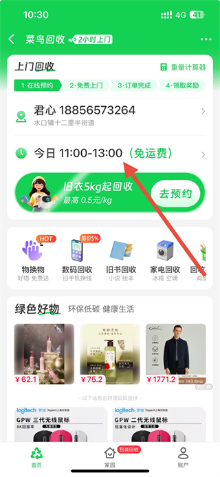 3、在菜鳥回收頁面點擊上門的時間,選擇確定上門的時間,點擊去預(yù)約按鈕。
