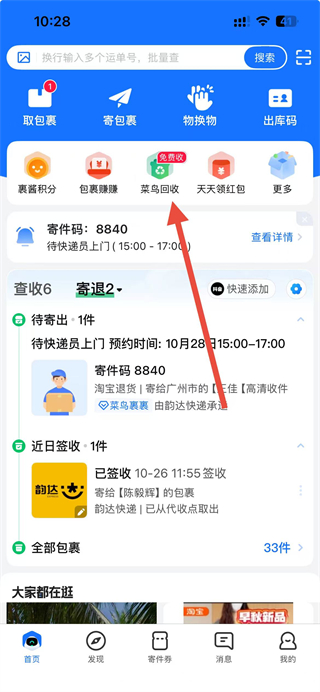 1、在菜鳥裹裹app首頁點擊菜鳥回收選項,進(jìn)入菜鳥回收頁面。