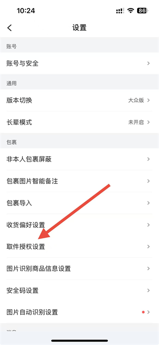 3、在設(shè)置界面,點擊取件授權(quán)設(shè)置選項,進(jìn)入取件授權(quán)頁面。
